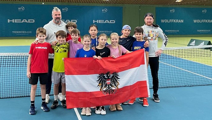 Mit Ararat Danilyan, Lionel Frießnegg, Giorgio Lorenzetti, Fabian Leitner, Theodor Kojnek, Luca Sageder, Zoey Zandomeneghi, Marie Schmidhofer, Vera Houdek und Lena de Vries war ÖTV-U10-Nationaltrainer Martin Kondert gemeinsam mit dem WTV-Kidstennis- und -Jugendkoordinator Stefan Weber am vergangenen Freitag nach Bayern angereist. Nach dem gemeinsamen Abendessen wurden am Samstag, wo mit den grünen Bällen gespielt wurde, und am Sonntag, mit den harten, gelben Bällen, Gruppen zu je zwei Spielern bzw. Spielerinnen gebildet. Innerhalb jeder Gruppe wurden so vier Einzelspiele und ein Doppel ausgetragen, mitunter wurden die Gruppen auch ein wenig durchgewechselt. Doch das Ergebnis blieb an beiden Tagen dasselbe: jeweils 19:6 für Österreich! Die rot-weiß-rote Dominanz war bei Burschen und Mädchen gleichermaßen eklatant: Die Ersten gewannen die beiden Wertungstage mit 12:3 und 11:4, gesamt also mit 23:7, die Letzteren mit 7:3 und 8:2, ergibt gesamt 15:5. Und auch beim Fußballspielen, das bei einem Gleichstand entschieden hätte, stand für die ÖTV-Kids ein klarer 6:1-Sieg zu Buche.