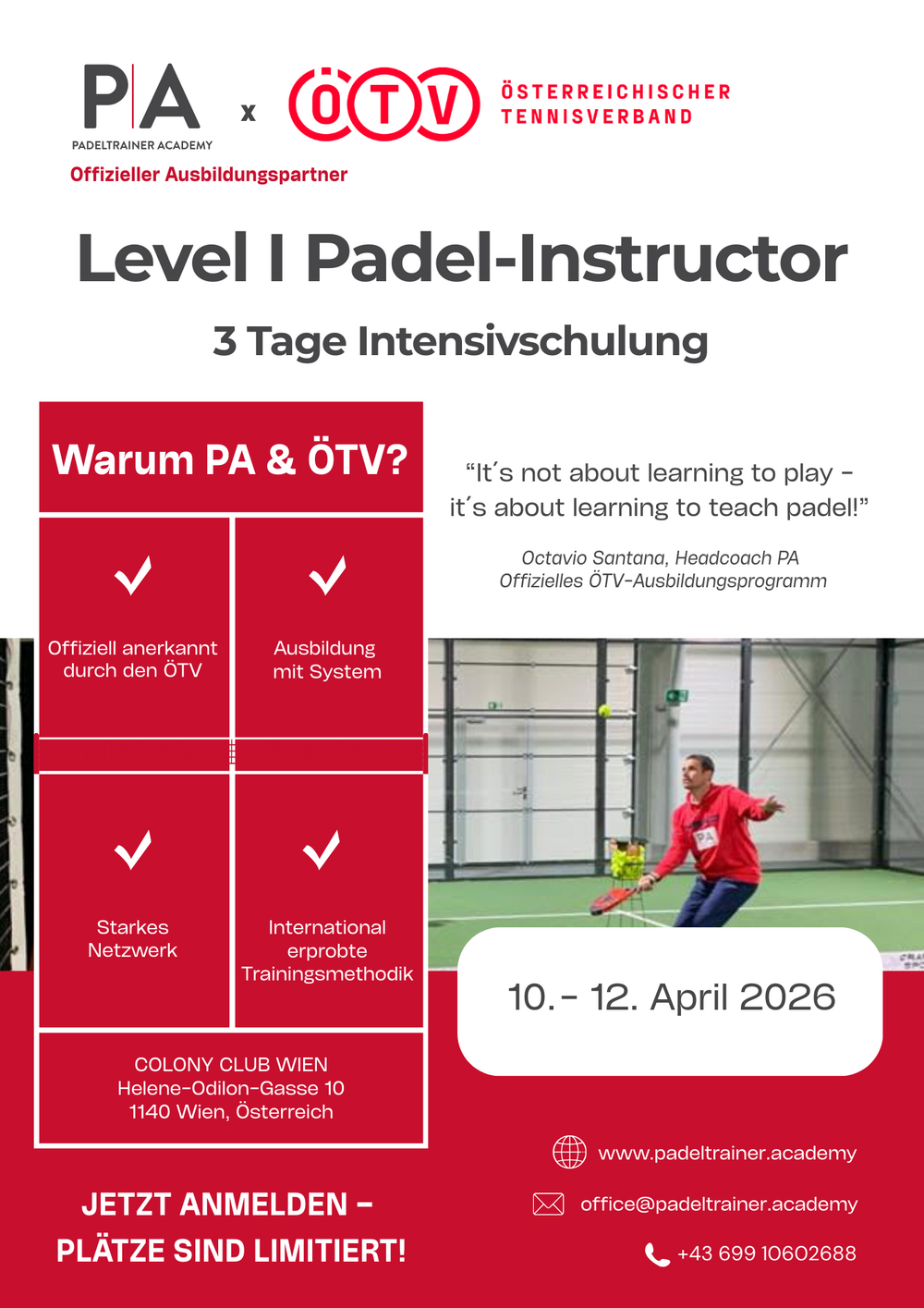 Padeltennis ist hierzulande vollauf angekommen, und ganz wie im Tennissport sind auch hier qualitativ hochwertige, hochprofessionelle Ausbildungen essentiell, um den Sport in Österreich auf die nächste Ebene zu bringen. Dafür bürgt die Padeltrainer.Academy, die in Zusammenarbeit mit dem Österreichischen Tennisverband demnächst die Ausbildung zum Level 1 Padel-Instructor anbietet. Der Kurs findet vom 10. bis zum 12. April 2026 in Form einer dreitägigen Intensivschulung im Colony Club (Helene-Odilon-Gasse 10, 1140 Wien) statt. Die Plätze sind limitiert. Meldet euch jetzt gleich an – und macht den ersten Schritt zum geschulten Padelcoach.