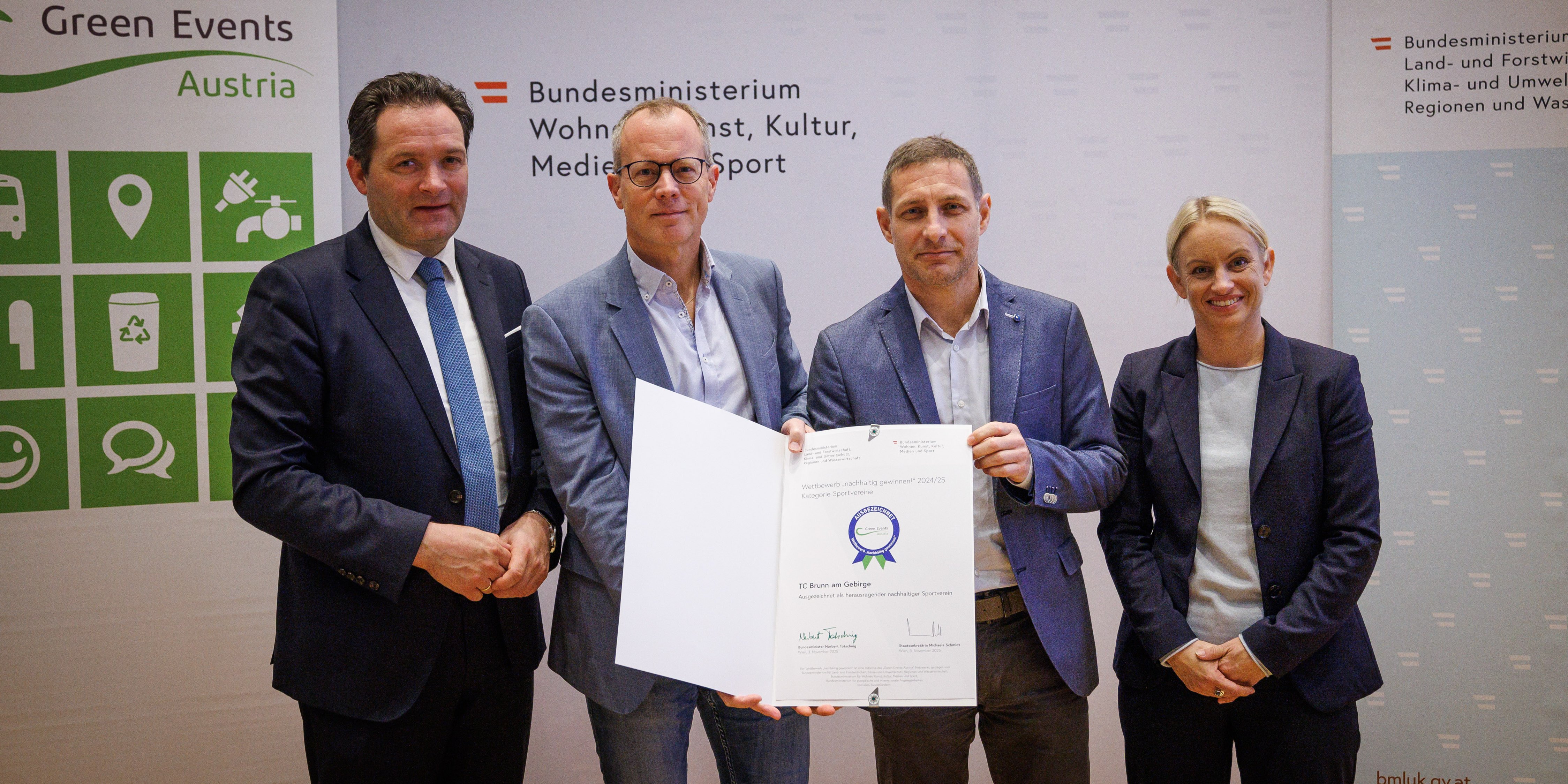 Großer Bahnhof für den TC Brunn am Gebirge! Norbert Totschnig, Bundesminister für Land- und Forstwirtschaft, Klima- und Umweltschutz, Regionen und Wasserwirtschaft, und Michaela Schmidt, Staatssekretärin im Bundesministerium für Wohnen, Kunst, Kultur, Medien und Sport, haben gemeinsam mit dem „Green Events Austria“-Netzwerk die 29 nachhaltigsten Feste, Kulturevents, Sportveranstaltungen und Sportvereine in Österreich gewürdigt – und der im Jahr 1972 gegründete, traditionsreiche Verein aus dem Kreis Südost in Niederösterreich war mittendrin statt nur dabei, unter den zwölf Sieger:innen des Wettbewerbs „nachhaltig gewinnen!“. Denn im Rahmen der Green Events Austria Tagung & Auszeichnungsveranstaltung am 3. November im dritten Wiener Gemeindebezirk wurde der TC Brunn am Gebirge nach seiner Nominierung 2020/21 und seinem Sieg 2023/24 zum nunmehr zweiten Mal ausgezeichnet, und zwar in der Kategorie Sportvereine 2024/25. Die diesjährigen Nominierten und Ausgezeichneten erhielten ein Preisgeld von insgesamt 20.000 Euro.