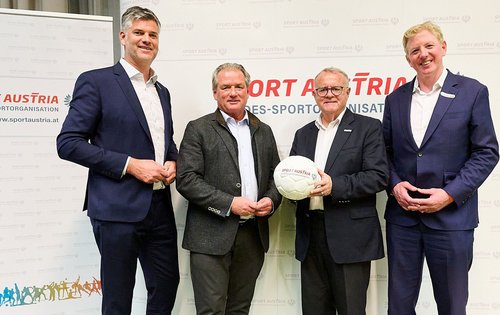 Das Sport-Austria-Präsidium, von links nach rechts: Geschäftsführer Gerd Bischofter, Vizepräsident Leistungs- und Spitzensport Thomas Reichenauer, Präsident Hans Niessl, Vizepräsident Breitensport Peter McDonald.