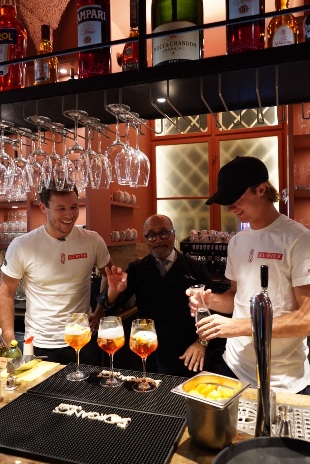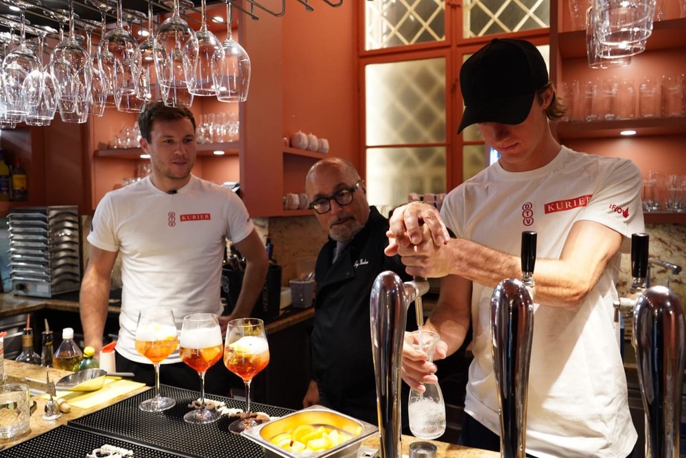 Und weil Italien bekanntlich auch bei den Getränken und insbesondere beim Kaffee ganz vorne dabei ist, machte sich anschließend Lukas Neumayer an einen Espresso und Jurij Rodionov sich an einen Latte Macchiato. Den krönenden Abschluss der Gaumenfreuden bildete ein Aperol, fabriziert durch das Doppel Miedler/Neumayer. Wie sich die ÖTV-Asse bei ihrem Spezialtraining so geschlagen haben, das seht ihr demnächst auf den Social-Media-Channels des Österreichischen Tennisverbands.